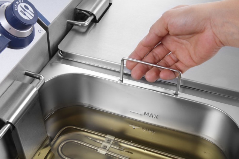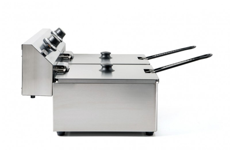 Met 2 verwarmingselementen van elk 3300W. Elk element heeft zijn eigen stekker, er zijn dus 2 stopcontacten nodig. Behuizing en olietank van roestvast staal. Voorzien van een uitneembaar element met uitschakelfunctie bij het verwijderen. De vetpan is eveneens uitneembaar wat het reinigen vergemakkelijkt. Overzichtelijke bediening met controlelampje voor de temperatuur. Temperatuur instelbaar tot 190°C. Een maximaalthermostaat zorgt voor de beveiliging tegen oververhitting welke middels de reset knop aan de onderzijde van het elementdeel weer is in te schakelen. Een frituurmand met een extra lange handgreep maakt dit model tot een prettig apparaat voor intensief gebruik. Koude zone beschermt de oliekwaliteit. Inclusief frituurmandje en deksel.