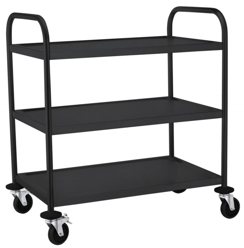 Gemaakt van roestvast staal met een mat zwarte finish. Voorzien van 3 bladen met geluiddempend materiaal aan onderzijde blad. Maximale belasting per blad 50 kg. Met 4 zwenkwielen, waarvan 2 geremd, voorzien van hoekbeschermers. Afstand tussen de bladen 270 mm. Werkblad 830x510. Flatpack levering.