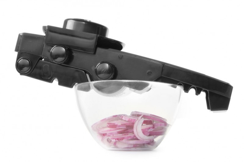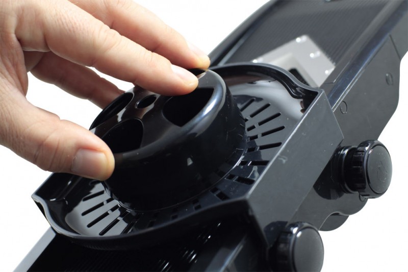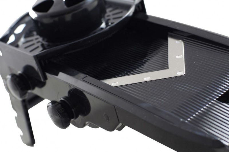 Inclusief 5 hoogwaardige roestvast stalen messen. Uitklapbare voet met rubber noppen. V-vormig plakjes- en golfmes. Meskammen voor julienne of frites, 6 of 9 mm breed. Instelbare snijddikte 1 tot 9 mm. Producthouder met metalen pinnen. Hoogte 140 mm (met uitgeklapte voet).