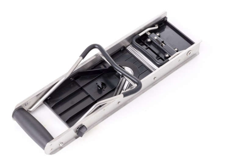 Gemaakt van AISI 304 roestvast staal en ABS. De dikte kan worden gewijzigd door de pad, 1,5 mm, 2,5 mm en 3,5 mm te vervangen. Met 2 pads voor julienne: 3,5 mm en 7 mm dik. Ontgrendel de pads met de enkele ontgrendelknop. Intrekbare poten zijn bekleed met antisliprubber, voor stabiliteit tijdens gebruik. Kan vrijstaand worden gebruikt, op een kom of zelfs in de hand. Wordt geleverd met een opbergdoos voor de pads, een producthouder om de vingers tijdens het snijden te beschermen en een bladbescherming voor veilige opslag. Vaatwasmachinebestendig.