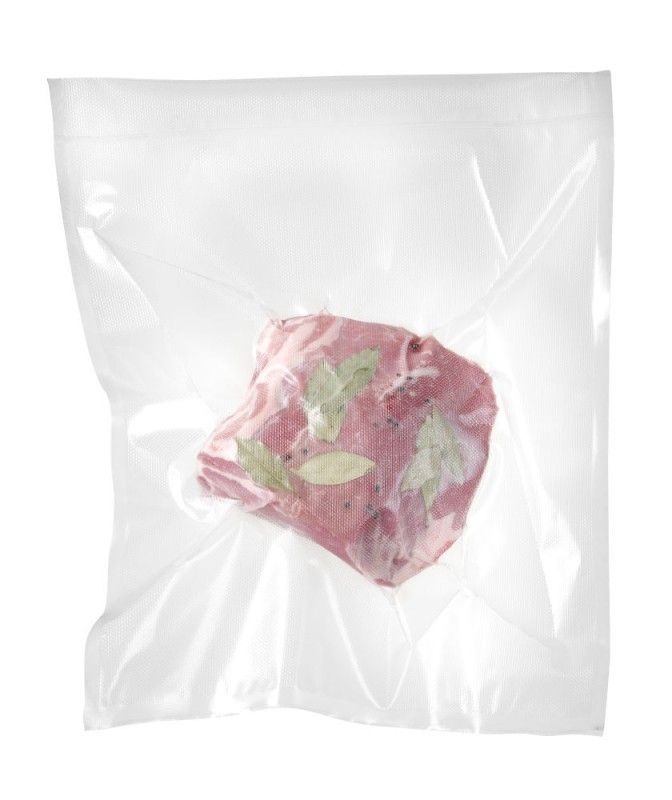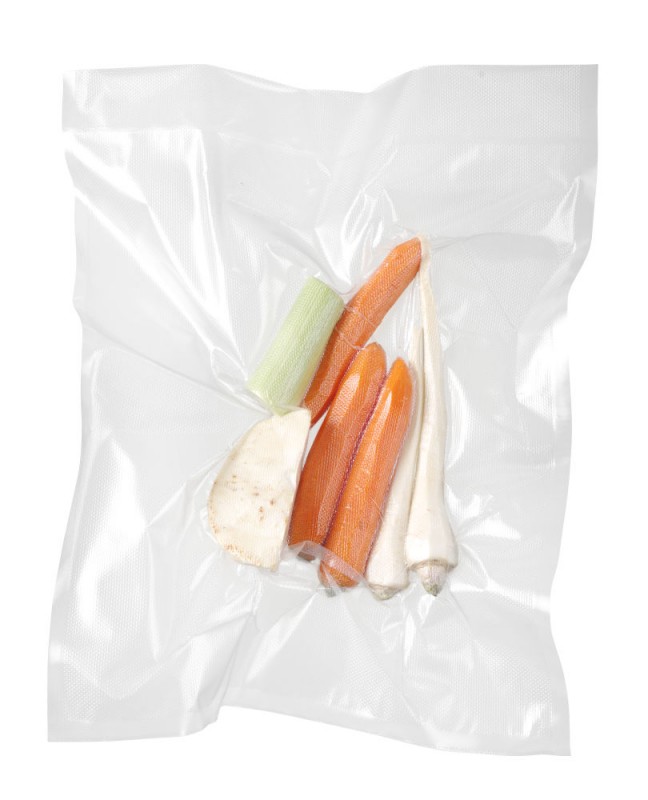 2-laags, binnenlaag 60 μm contact met levensmiddelen goedgekeurd Polyethyleen, buitenlaag 15 μm Polyamide (nylon). Totale dikte is 75 μm. De gebruikte materialen fungeren als een UV-filter. Het reliëf verbetert de luchtstroom uit de zak tijdens het vacuümverpakkingsproces. Zakken kunnen worden gebruikt bij temperaturen van -20˚ tot 100˚C. Geschikt voor kamer- en externe vacuümverpakkingsmachines.