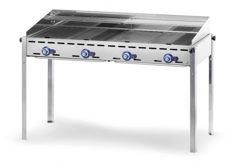 Inclusief 2 geëmailleerde gietijzeren bakplaten en 2 grillroosters Gastronorm 1/1. Voorzien van windkap. Verhoogd roestvaststalen rooster voor het warmhouden van sauzen en gereed product. Gasslang aan te sluiten d.m.v. snelkoppeling. Slang en drukregelaar vast aan gasfles - verbeterde draagbaarheid.