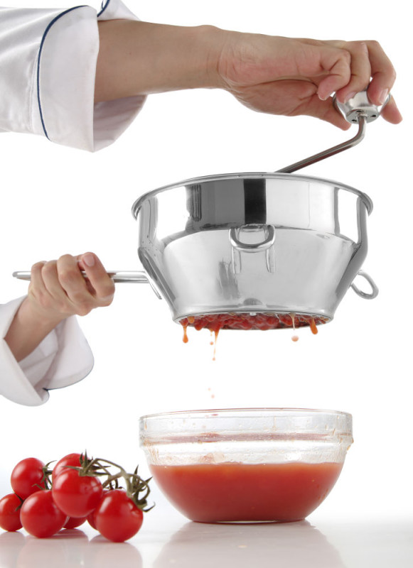 Zeer geschikt voor de bereiding van gebonden soep en tomatensaus. Inclusief 2 zeven (ø140 mm), grof en fijn.