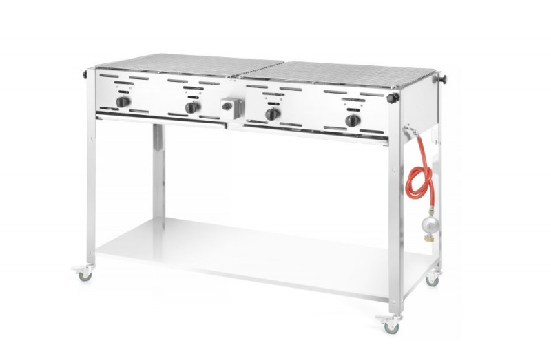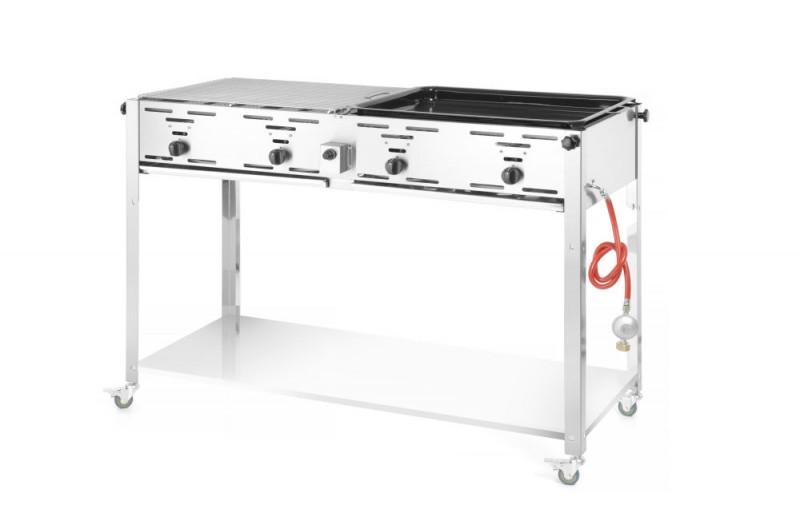 Roestvast stalen frame met 2 vetopvanglades. Geschikt voor butaan- en propaangas en uitgerust met 4 onafhankelijk regelbare branders. Inclusief 2 vernikkelde bovenroosters en 1 geëmailleerde braadpan (590x480 mm inwendig). Thermokoppel en elektronische ontsteking. Inclusief gasslang en drukregelaar. Verbruik 0,8 m³/u. Op onderstel met onderplaat en 4 wielen voor simpel verplaatsen.
