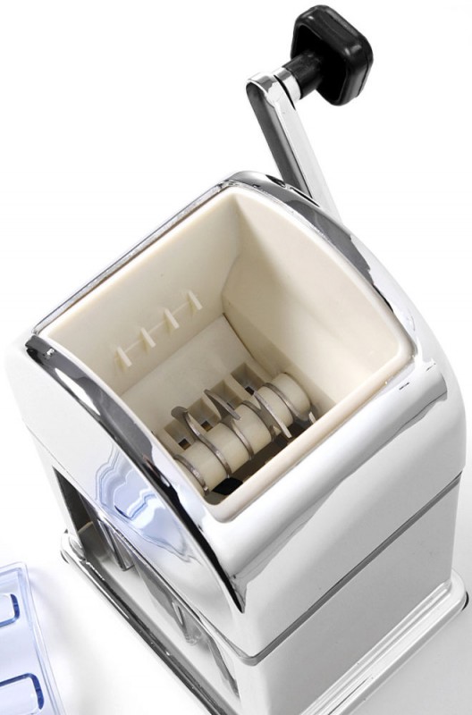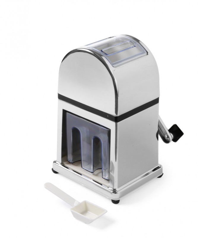 Verchroomde zink legering met roestvast stalen messen. Inclusief kunststof ijs schepje. Met uitneembare ijs container.
