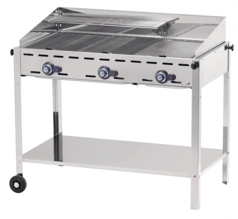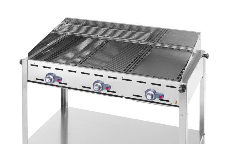 Inclusief geëmailleerde gietijzeren bakplaat en 2 grillroosters Gastronorm 1/1. Voorzien van windkap. Verhoogd roestvast stalen rooster voor het warmhouden van sauzen en gereed product. Gasslang aan te sluiten d.m.v. snelkoppeling. Slang en drukregelaar vast aan gasfles - verbeterde draagbaarheid.