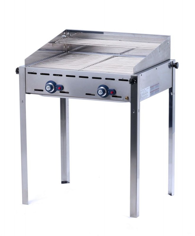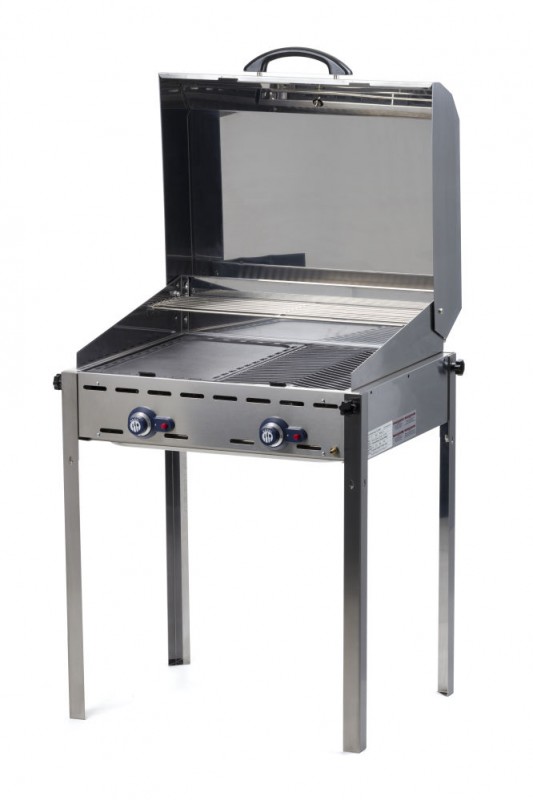 Voorzien van windkap. Verhoogd roestvast stalen rooster voor het warmhouden van sauzen en gereed product. Gasslang aan te sluiten d.m.v. snelkoppeling. Slang en drukregelaar vast aan gasfles - verbeterde draagbaarheid.