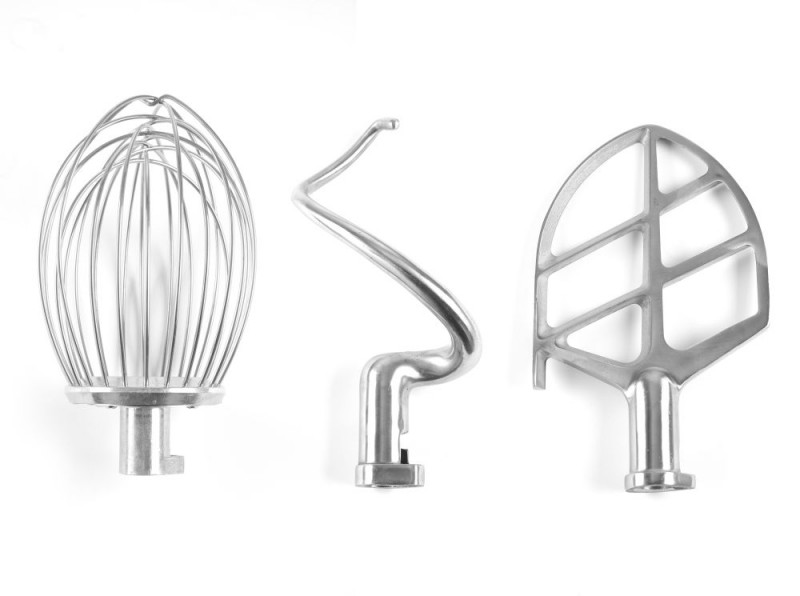 Wordt geleverd met roestvast stalen AISI 430-accessoires: een draadwisk, een platte klopper en een deeghaak. Hoogwaardige wormaandrijving van verchroomd staal en bronzen tandwielen.