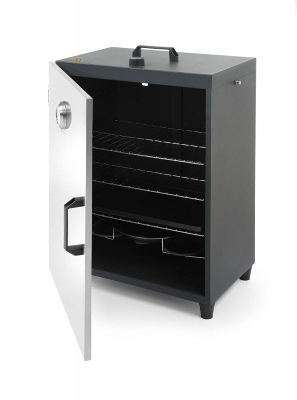 De rookoven is ideaal voor het roken en bereiden van vis, vlees, ham en groenten. Gemaakt van roestvast staal met magnetisch sluitende dubbel geïsoleerde deur. Temperatuur in te stellen via een thermostaat, geïntegreerde thermometer in de deur. Voorzien van een ventilatieopening aan de achterzijde. Wordt geleverd met 3 stuks 400x279 mm roosters en beugel met 3 haken.