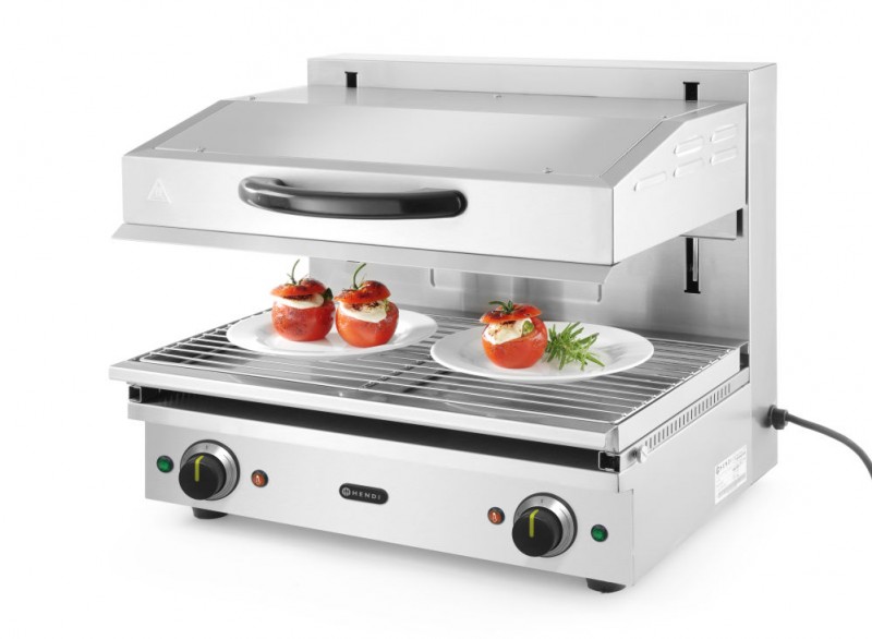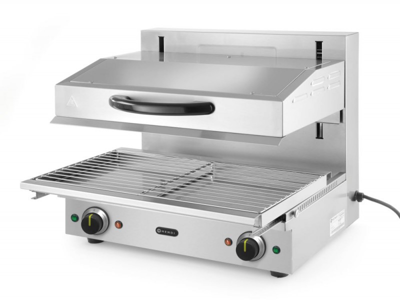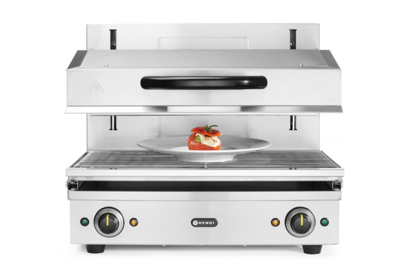 Type 600 - roestvast stalen frame. Ideaal voor grillen of het opwarmen en warmhouden van gerechten. Thermostaat traploos instelbaar tot maximaal 300°C, met controlelampjes. 2 afzonderlijk instelbare warmtezones. Hoogte variabel instelbaar door licht lopend liftsysteem. Verwijderbare lekbak met rooster van 590x350 mm.