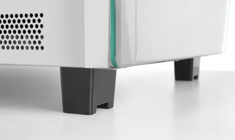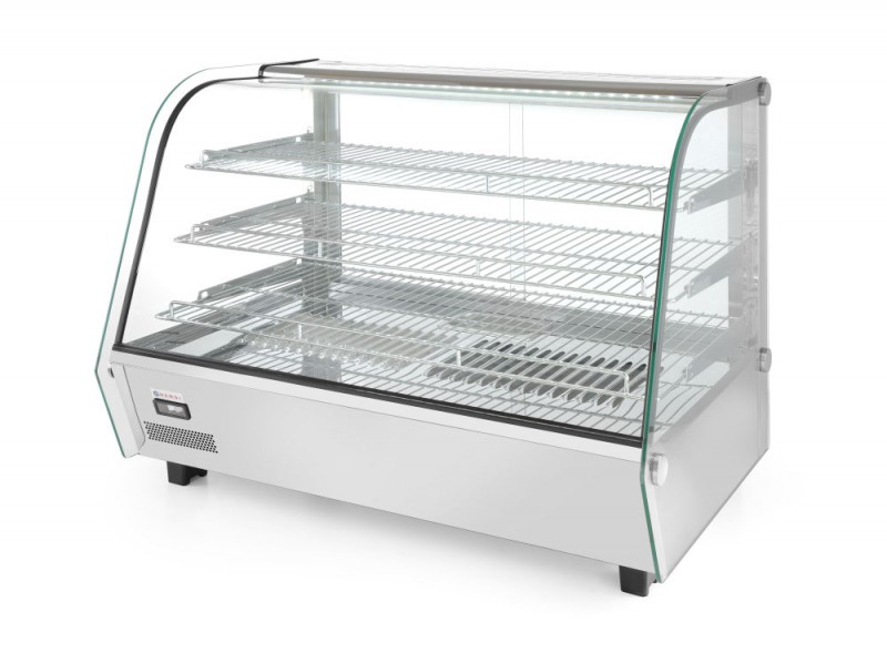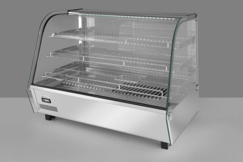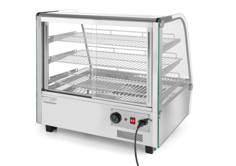 Voorzien van dubbel glas en gebogen glas aan de voorzijde. Toegankelijk door 2 schuifdeuren in de achterzijde. Behuizing van roestvast staal. Met LED verlichting in het plafond. Inclusief 3 verchroomde schappen, in hoogte verstelbaar. Thermostaat en scherm. Temperatuurbereik: 30 tot 90°C.