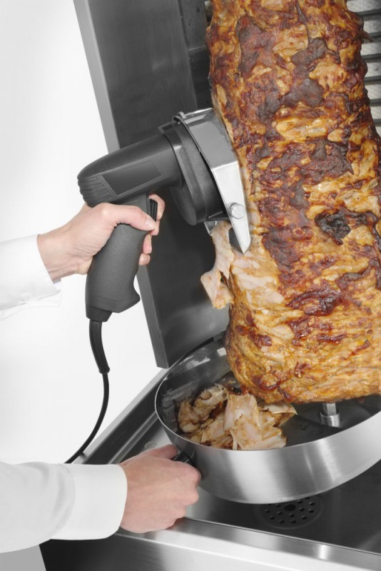 Voor het snijden van döner kebab, shoarma, gyros, etc. 2 roestvast stalen ø100 mm messen, 1 glad en 1 gekarteld. Het blad draait met 2600 tpm. Eenvoudig instelbare snijdikte van 0 mm tot 8 mm. Mes beschermer gemaakt van roestvast staal bevorderd veiligheid tijdens het snijden. Greep en behuizing van antislipmateriaal. AAN/UIT-schakelaar geïntegreerd met de behuizing. Overbelastingsbeveiliging met een resetknop. Inclusief slijpsteen. Gewicht 1 kg.