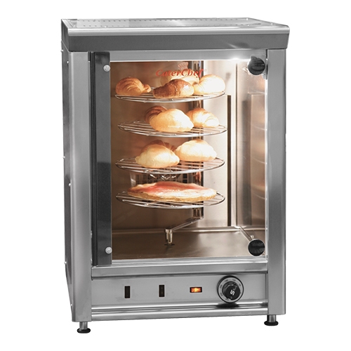 de roterende CaterChef heteluchtoven biedt een grote capaciteit en directe visuele controle en presentatie van uw product. Het apparaat functioneert d.m.v. een constante interne lucht circulatie en is uitgerust met thermostaat, rotatie/hetelucht knop en lichtschakelaar, geleverd inclusief 4 roosters Ø30cm