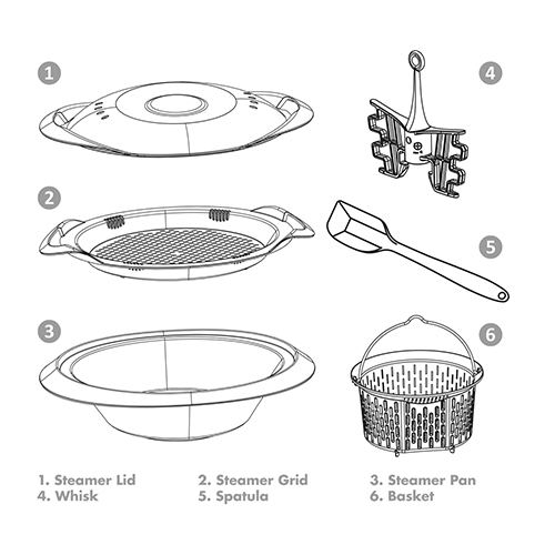 te bedienen middels touchscreen en draaiknop, verder voorzien van inductieverwarming, een vaatwasbestendige rvs mengbeker van 2 liter, uitneembaar mes stel, beveiligde deksel, 40-11000 t.p.m., nauwkeurige verhitting van 37,0 tot 110,0 °C, tijdklok en ingebouwde weegschaal, ook zijn de volgende accessoires standaard meegeleverd: spatel, garde, rijstmand en stoompan