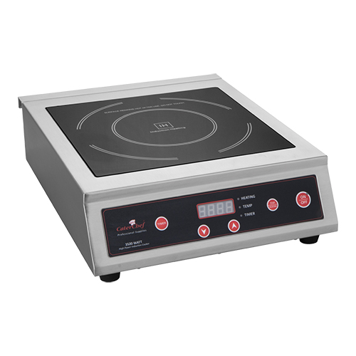 inductiekookplaat voorzien van digitale timer 0-180 minuten, temperatuurinstelling tussen 60-240°C, vermogen instelbaar 500-3500W, automatische uitschakeling, verhittings-oppervlakte Ø26cm, roestvrijstalen ommanteling
