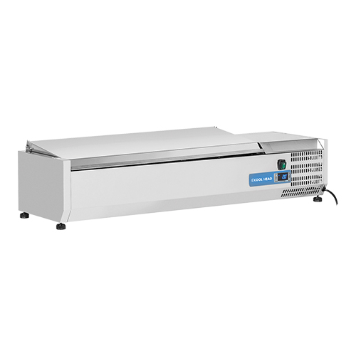 GN maatvoering voor max. 15cm diep, roestvrijstaal, thermostatisch regelbaar +2°C/+8°C, verlichte hoofdschakelaar, wordt zonder GN bakken geleverd, met roestvrijstalen klapdeksel