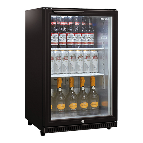 zwart, gemoffeld plaatstaal voor koeling van o.a. flessen en blikjes, temperatuur digitaal instelbaar van +2°C/+10°C, met ventilator voor luchtcirculatie, binnenverlichting en twee verstelbare rekken (35x40cm) per deur, deuren zijn zelf sluitend