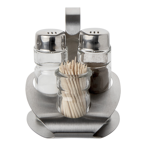 roestvrijstalen houder met peper- en zoutvaatje en tandenstokerhouder