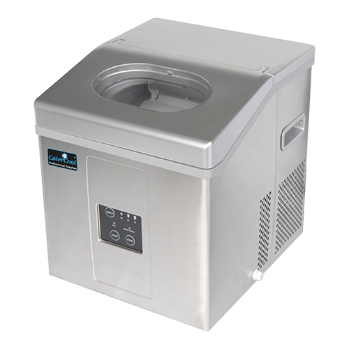 compact tafelmodel ijsblokjesmachine met kunststof behuizing, de capaciteit bedraagt circa 15kg per 24 uur en beschikt over buffervoorraad van circa 1kg en een waterreservoir van circa 2,5L, wanneer de buffervoorraad vol is wordt d.m.v. elektronische sensoren de productie van ijsblokjes gestopt, er is keuze uit 3 maten ijsblokjes