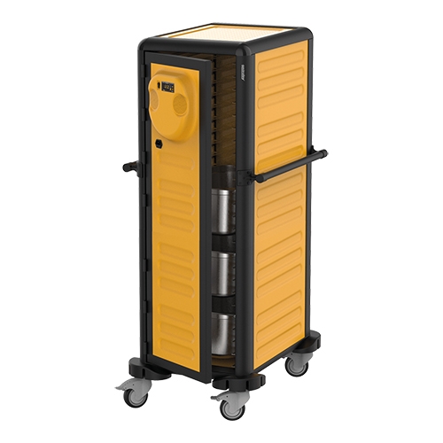 voor banket of catering, maakt het mogelijk de keuken naar de gast te brengen. Een gegarandeerde levering van uw gerechten op een temperatuur boven de 65°C, door de uitstekende isolatie wordt de gewenste temperatuur snel bereikt en langer vastgehouden. De warmhoudwagen is vervaardigd van dubbelwandig hoogwaardig ABS en beschikt over een metaal geëpoxeerd frame. De warmhoudwagen is voorzien van duwbeugel, 4 zwenkwielen waarvan 2 geremd, spiraalsnoer en regelbare digitale thermostaat van 65°C tot 90°C graden. Uitvoering voor 1/1 gastronorm plateaus of bakken