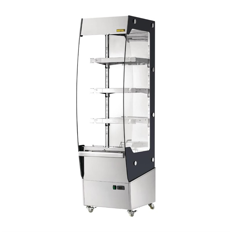 Modern vormgegeven warmhoudvitrine met gebogen glazen zijkanten en open voorzijde om impulsverkopen te stimuleren. Het compacte, maar toch ruime model is voorzien van displaypanelen voor labels en omdat producten ook op de bodem geplaatst kunnen worden wordt de capaciteit maximaal benut. Eenvoudig te positioneren met behulp van de meegeleverde wieltjes.