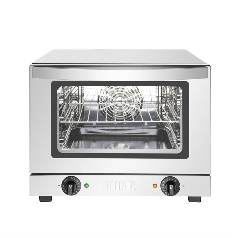 Met deze krachtige, betrouwbare 21L heteluchtoven van Buffalo bakt u eenvoudig al uw brood, pasteitjes en andere ovengerechten perfect gaar en bruin. Het compacte, stijlvolle ontwerp met eenvoudige bediening is ideaal voor kleinere keukens. De deur met dubbel glas is zeer stevig en zorgt voor uitstekende warmteretentie, waardoor de verbruikskosten beperkt blijven.