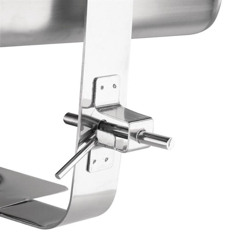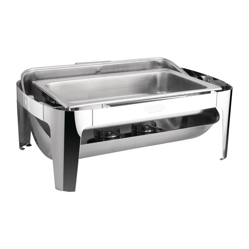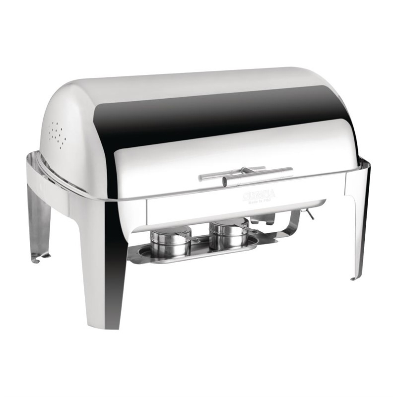 Hoogglans 18/8 RVS GN 1/1 chafing dish met rolltop deksel. Compleet met waterpan, voedselpan, deksel en 2 brandpastahouders. Afmeting 44(h)x67,5(b)x53(d)cm.