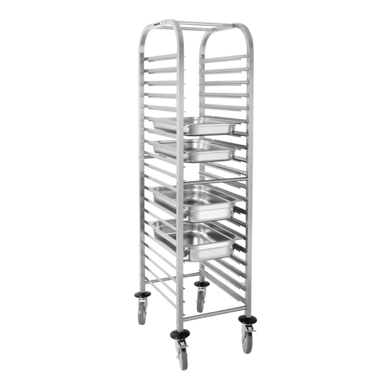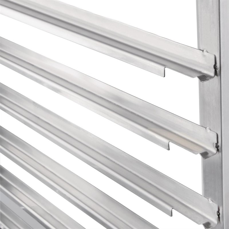 Hoogwaardig RVS GN 1/1 regaalwagen geschikt voor 20 bladen. Vier stevige zwenkwielen waarvan 2 geremd.