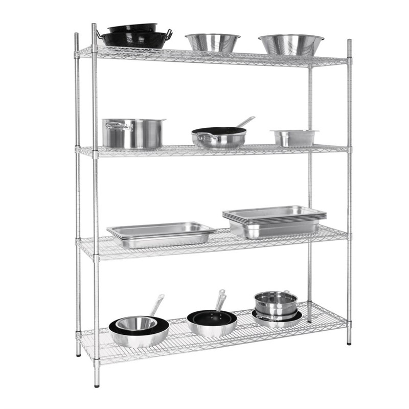 Multifunctioneel draadrekken systeem, ideaal voor het opslaan van voedingsmiddelen, pannen, linnengoed, servies en nog veel meer. Clip on planken en verdelers beschikbaar voor een grotere veelzijdigheid. Complete set bestaat uit 184cm hoge staanders met 4 schappen en clips.