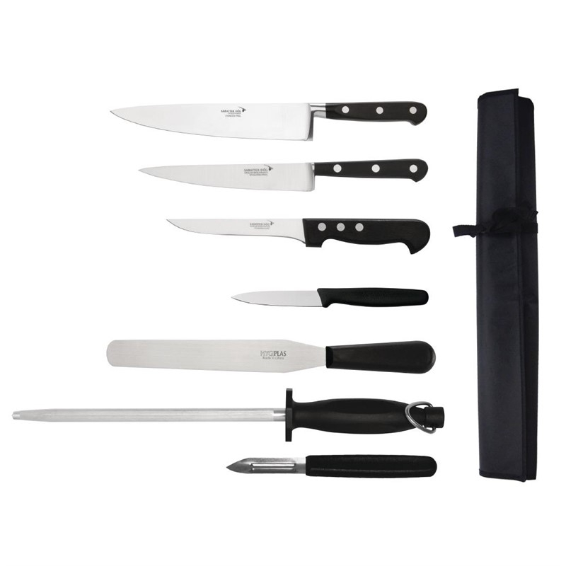 Top kwaliteit Sabatier messenset met thermoplastische heften en RVS lemmet. Geleverd in een zwart etui aangevuld met een Victorinox schilmes, Hygiplas paletmes, Vogue slijpstaaf en dunschiller. Vaatwasserbestendig.