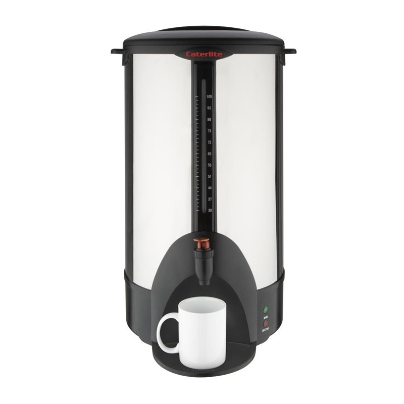 Dubbelwandige RVS percolator met een efficiënt warmte-element, niveau-indicator en aan/uit schakelaar. Niet geschikt voor snelfilterkoffie