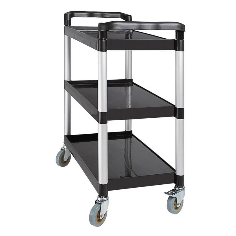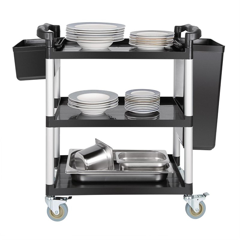 Stevige polypropyleen serveerwagen, ideaal voor de horeca. Voorzien van stevige wielen waarvan 2 geremd. Bestek- en afvalbak los verkrijgbaar.