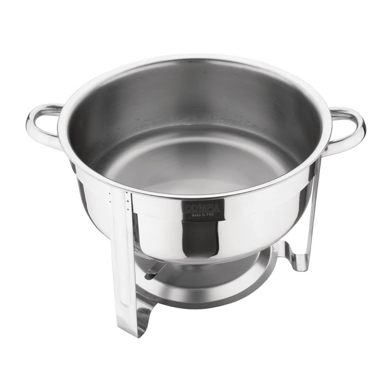 Gepolijst 18/0 RVS ronde set met waterpan, voedselpan, deksel en brandpastahouder. Afmeting 33(h)x42(b)x34,5(d)cm.