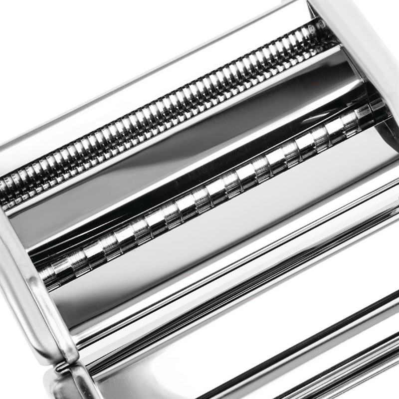 Maak fettuccine en tagliolini, lasagne, tagliatelle, spaghetti en taglierini in uw eigen keuken. Constructie van verchroomd staal met vernikkelde rollers. Het deeg is te produceren in verschillende diktes en 2 breedtes. De ravioli-snijder is eenvoudig te monteren voor perfecte resultaten. De motor-toepassing zorgt voor een snelle en eenvoudige productie met een minimum aan inspanning.