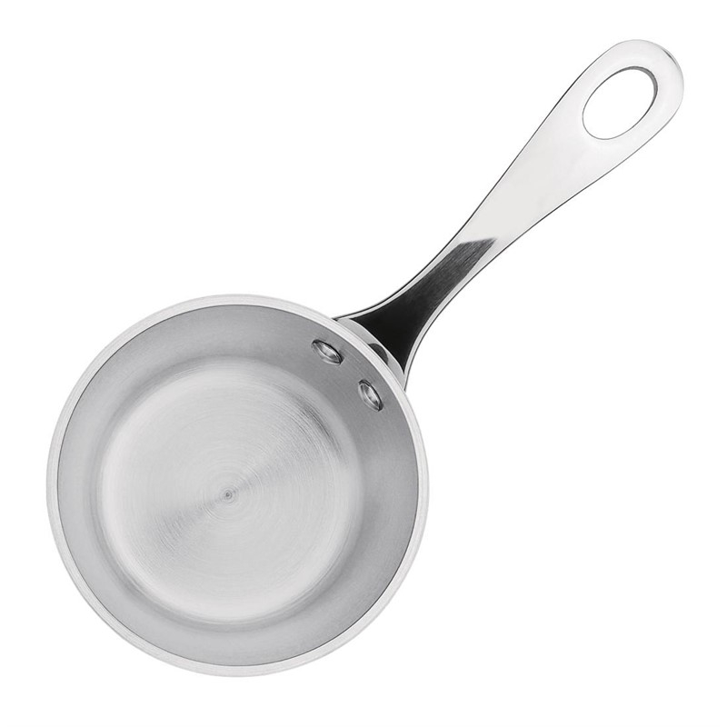 Mini pan met sandwichlaag van aluminium tussen RVS. Zorgt voor gelijkmatige verhitting zonder hotspots. Geschikt voor alle warmtebronnen inclusief inductie.