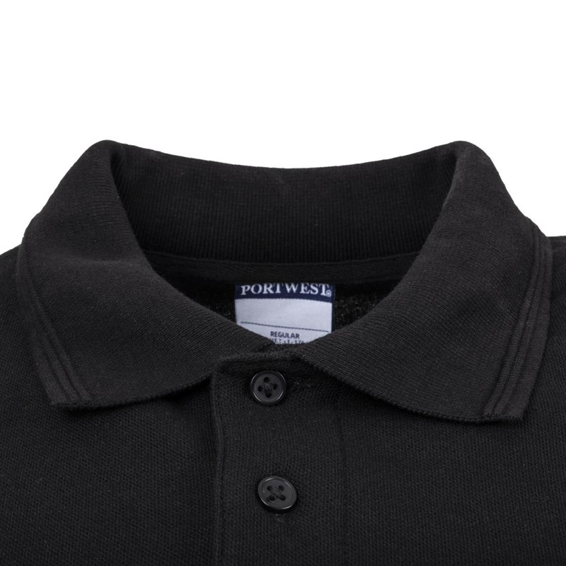 Slijtvaste polyester/katoenen piquéshirts met versterkte schouders, geribbelde boorden op de mouwen en gekleurde knopen. Geschikt voor chemisch reinigen. Maten S-XL.