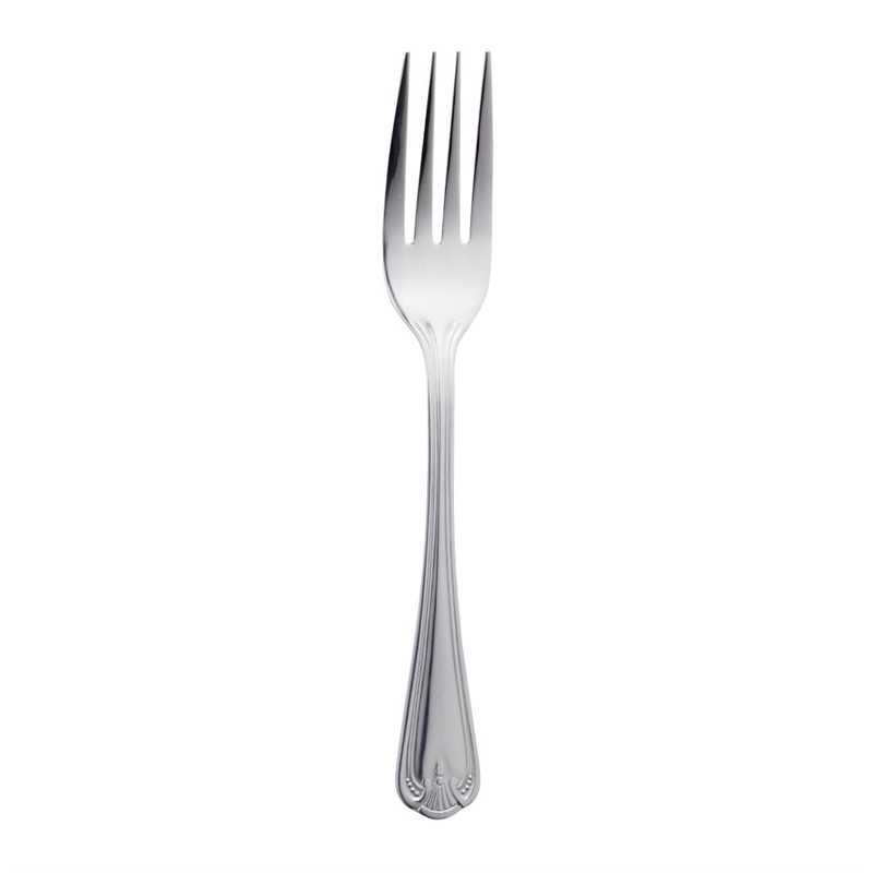 Gepolijst 18/0 RVS met schelpmotief op het heft. Prijs en verpakking per 12 stuks