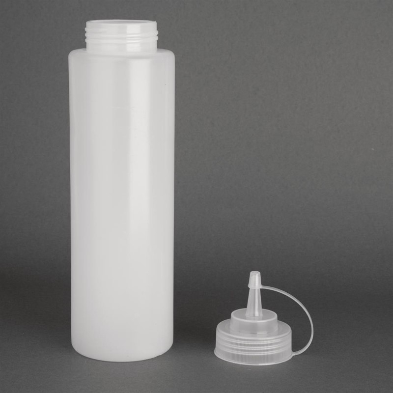 Flexibel, zacht polyethyleen met schroefdop en een brede hals voor eenvoudig bijvullen. Ideaal voor decoreren of doseren van saus. Kort de spuitmond zelf in voor de gewenste grootte.