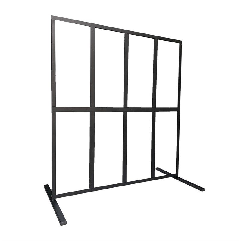 Multifunctioneel scherm met stalen frame en plexiglas panelen. Meerdere schermen kunnen aan elkaar verbonden worden. Geremde wielen.