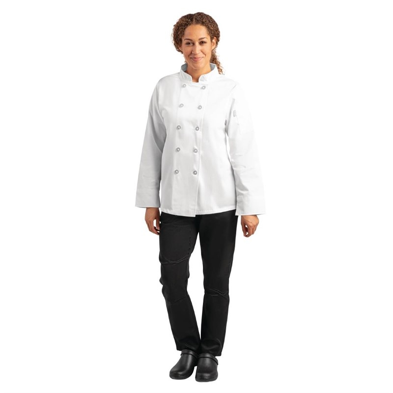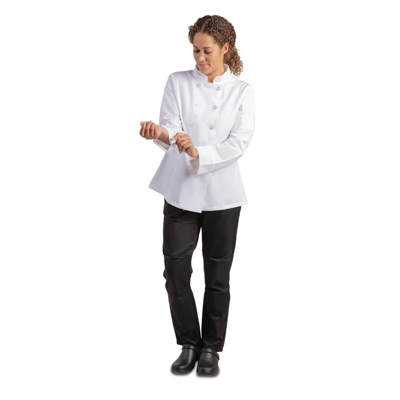 Getailleerde damesbuis met dubbele sluiting voor een slanke, flatterende vorm. Afgeronde manchetten.