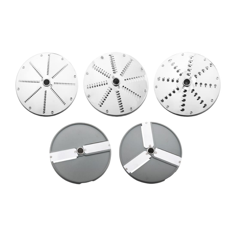 Geleverd met duwer, borstel en 5 snij- en raspschijven