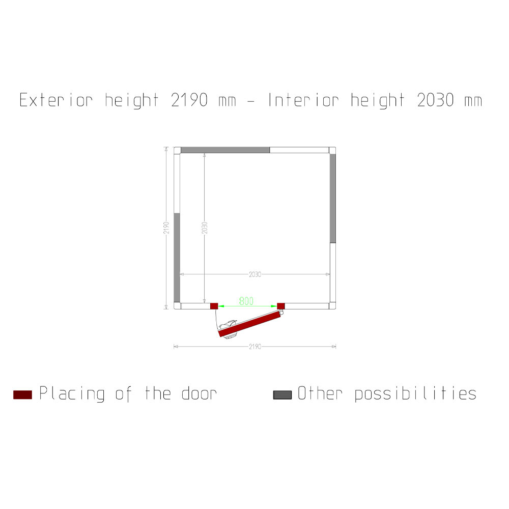 - Deur met nuttige doorgang 800 x 1900 mm (deur positionering naar keuze, aan alle 4 zijden).
