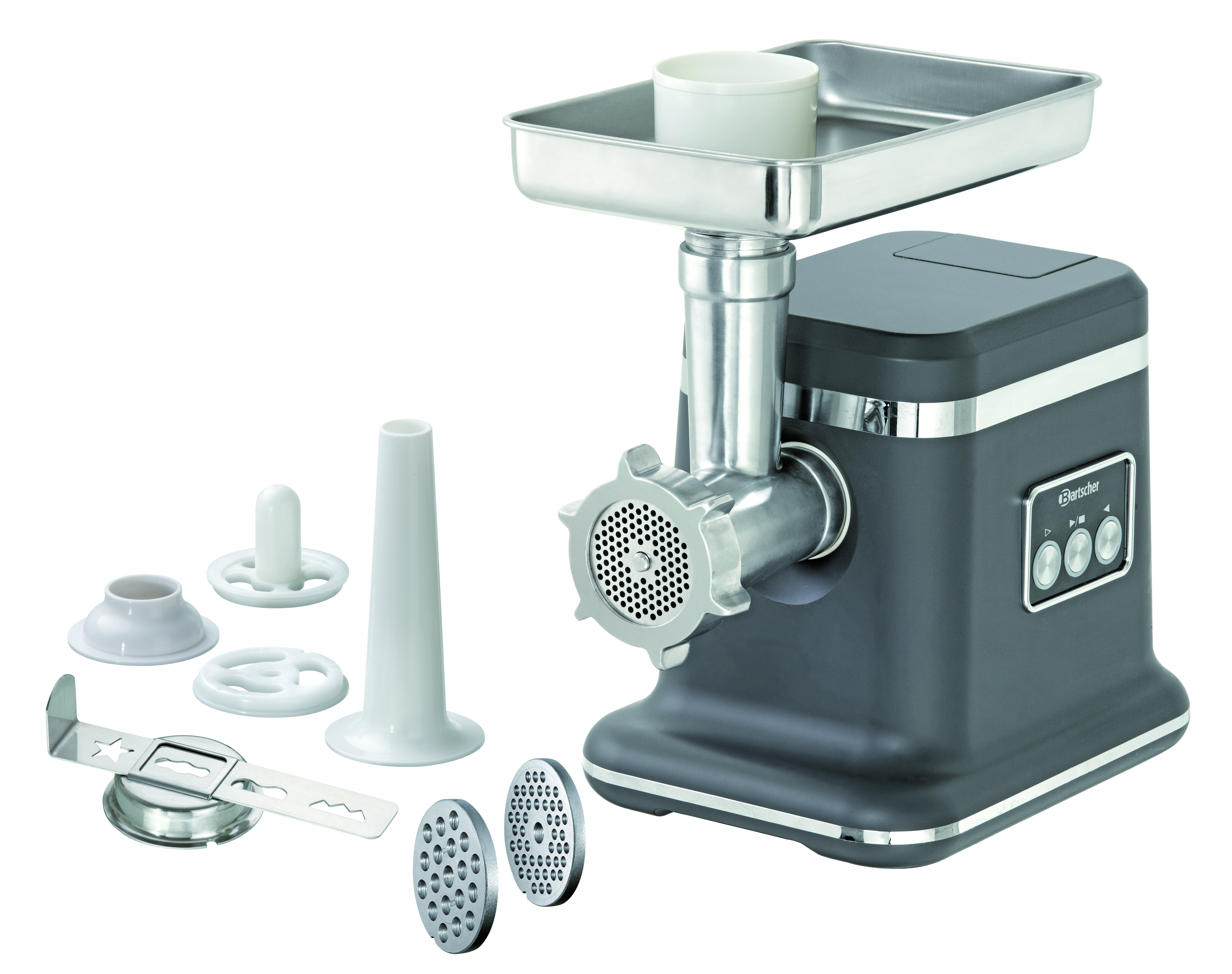 Inclusief: 1 roestvrijstalen mes, 4 vleugelig ,1 kebbe-voorzetstuk (oosters gerecht) ,1 voorzetstuk voor spuitbaksel ,1 stopper ,1 worstenstopper ,3 gatenschijven (3 mm, 4,8 mm, 8 mm)