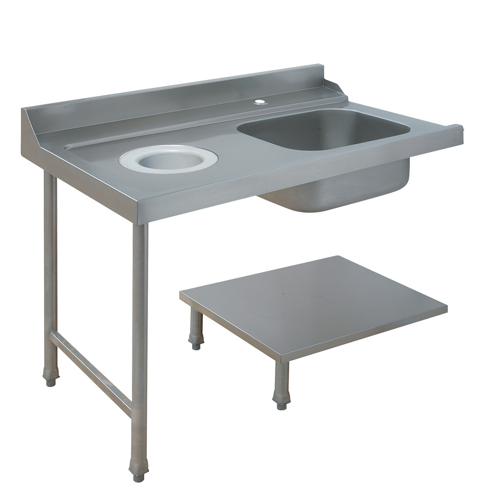 Spoeltafel met 2 kuipen 500x500x325 rechts druipvlak op kast met 2 schuifdeuren en nis voor vaatwasser