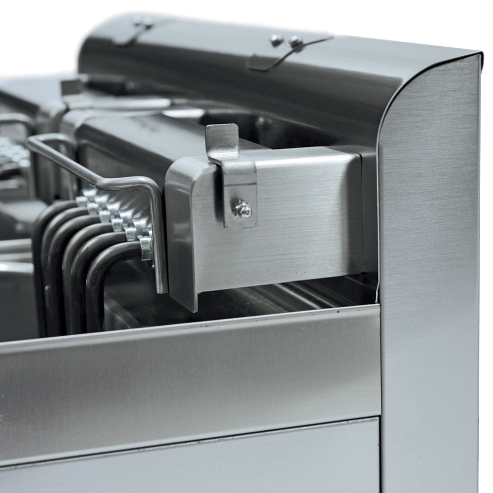 - " Diepgetrokken" kuip in roestvrij staal AISI 304 met alle inwendige hoeken afgerond voor eenvoudig en hygiënisch onderhoud, voorzien van een koude zone, de (kogel)aftapkraan van de kuip wordt aan de voorzijde van het apparaat geplaatst. Een verchroomd staaldraadrooster wordt in de kuip geplaatst om onzuiverheden vast te houden. Roestvrij stalen deksel.