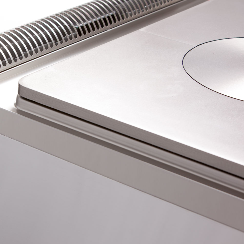 - Doorkookplaat in gietijzer (10mm) met hoog warmtegeleidingsvermogen, centrale verwijderbare brander, gasverwarming door een brander die zich in het midden van de verbrandingskamer bevindt, keramische isolatie. Regeling d.m.v. gaskraan (+/- 500°C), piëzo-elektrische ontsteking en thermokoppelveiligheid, toegankelijkheid aan de voorzijde voor een zeer eenvoudig onderhoud.