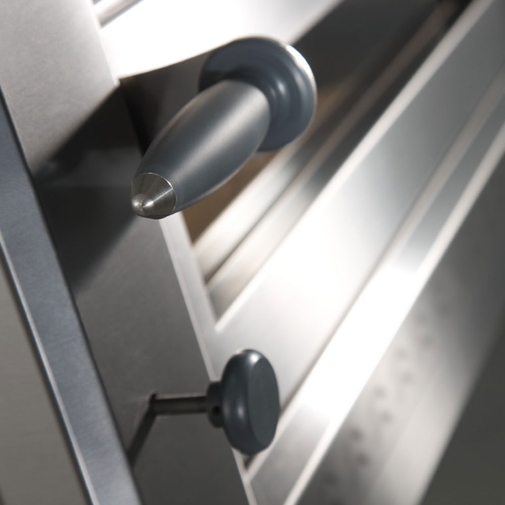 - Voorkant in R.V.S., "decoratieve verwijderbare dampkap" en "onafhankelijk en ergonomisch" bedieningspaneel in geverfd staal.