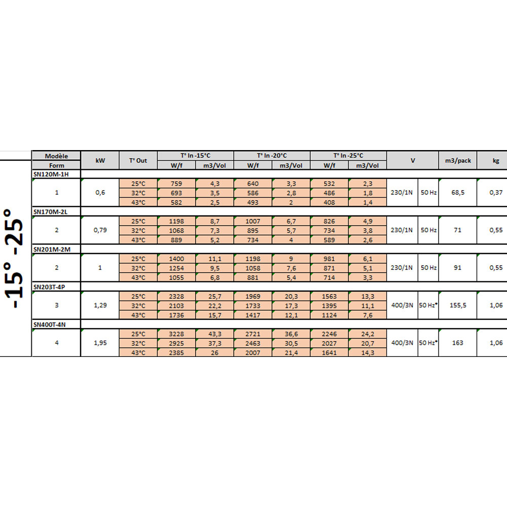 - Koelvermogen 586 (W/f) voor kamerinhoud 2,8 m³ / 2800 Lit (T° intern -20° C & T° extern +32° C).