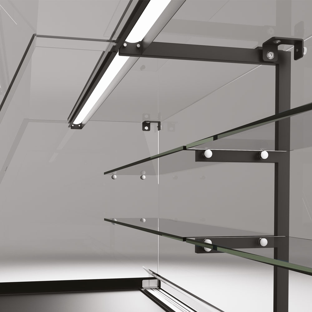 - Gehard glas (Extra Clear), 90° open- en inklapbaar frontraam met veiligheidsstop (eenvoudig onderhoud) en geïntegreerde anticondensvoorziening (laagspanning 12V) in het scharnier, zijramen met geïntegreerde anticondensvoorziening (laagspanning 12V), standaard tussenplank.