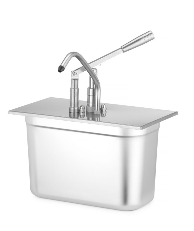 Behuizing, veer in de dispenser en pompsysteem gemaakt van AISI 304 roestvast staal. Het onderste element van de dispenser is gemaakt van polypropyleen. Deksel en dispenserpomp verwijderbaar. Portie volume: 35 ml Niet vaatwasmachinebestendig. 3 maten verkrijgbaar: GN 1/6 (code: 558133) GN 1/4 (code: 558140) GN 1/3 (code: 558157) Geschikt voor GN -containers met een hoogte van 200 mm (niet inbegrepen).